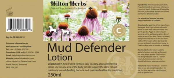 Mud Defender Lotion kan veilig worden aangebracht op een beschadigde, pijnlijke, met korstjes bedekte huid en mag niet prikken wanneer het wordt aangebracht. De lotion is niet ontworpen om te worden gebruikt als een barrièrecrème, maar bevat olie die het binnendringen van water moet helpen voorkomen. Zoals bij elk nieuw product adviseren wij patchtesten voorafgaand aan het gebruik als je paard een gevoelige huid heeft.