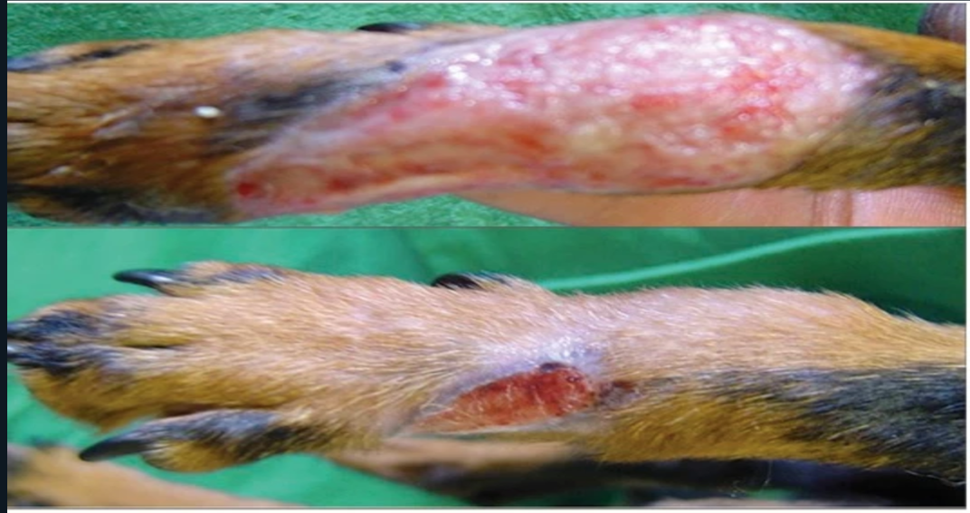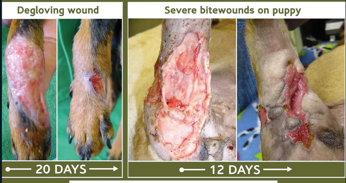 (Rijt)wonden, hyaloma tekenbeetnecrose, hot spots, abcessen, zadelpijn, habronema (= maagparasiet, voornamelijk bij paarden), wild vlees, grote plekken door het likken, bloeduitstortingen, ontsteking van de huid van de gehoorgang (zwemmersoor), huidziekte met zweren, ontsteking voeten konijn (aan de hakken), huidallergieën, eczeem, enz.